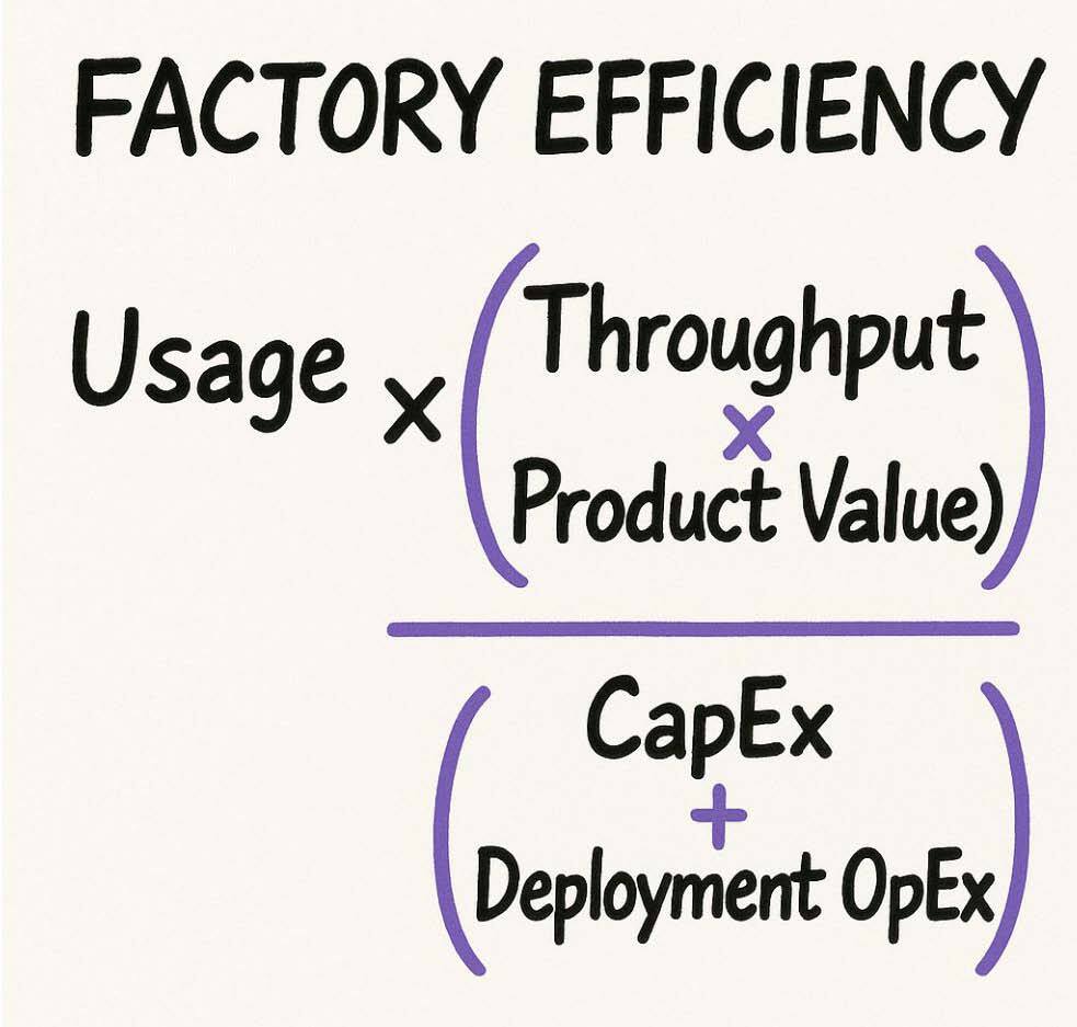 Factory Efficiency (or FE) = Usage × (Throughput×Product Value) / (CapEx+Deployment OpEx)