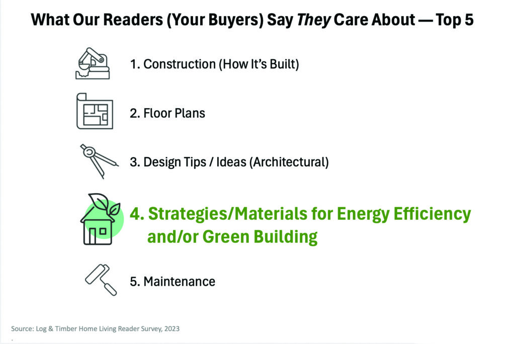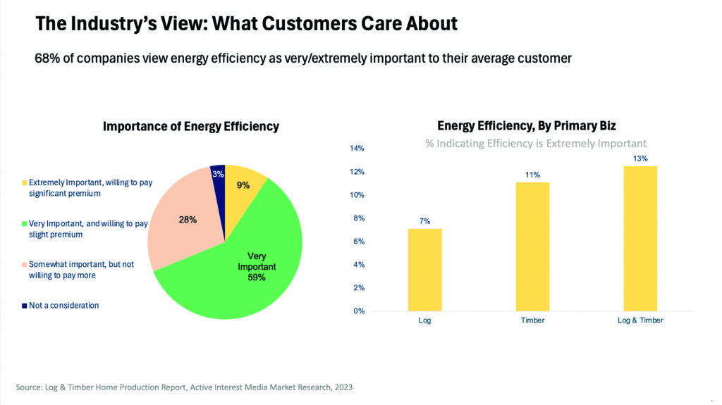 - Although the interest in log construction is driven primarily by aesthetics, most customers also want energy efficiency and will pay a slight premium for it.