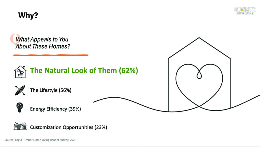 The magazine Log & Timber Home Living regularly conducts surveys of both consumers and businesses in the log and timber home industry. At the most recent National Association of Home Builders’ Building Systems Summit in October 2023, Editor-in-Chief Donna Peak gave a presentation on the results of their most recent surveys.